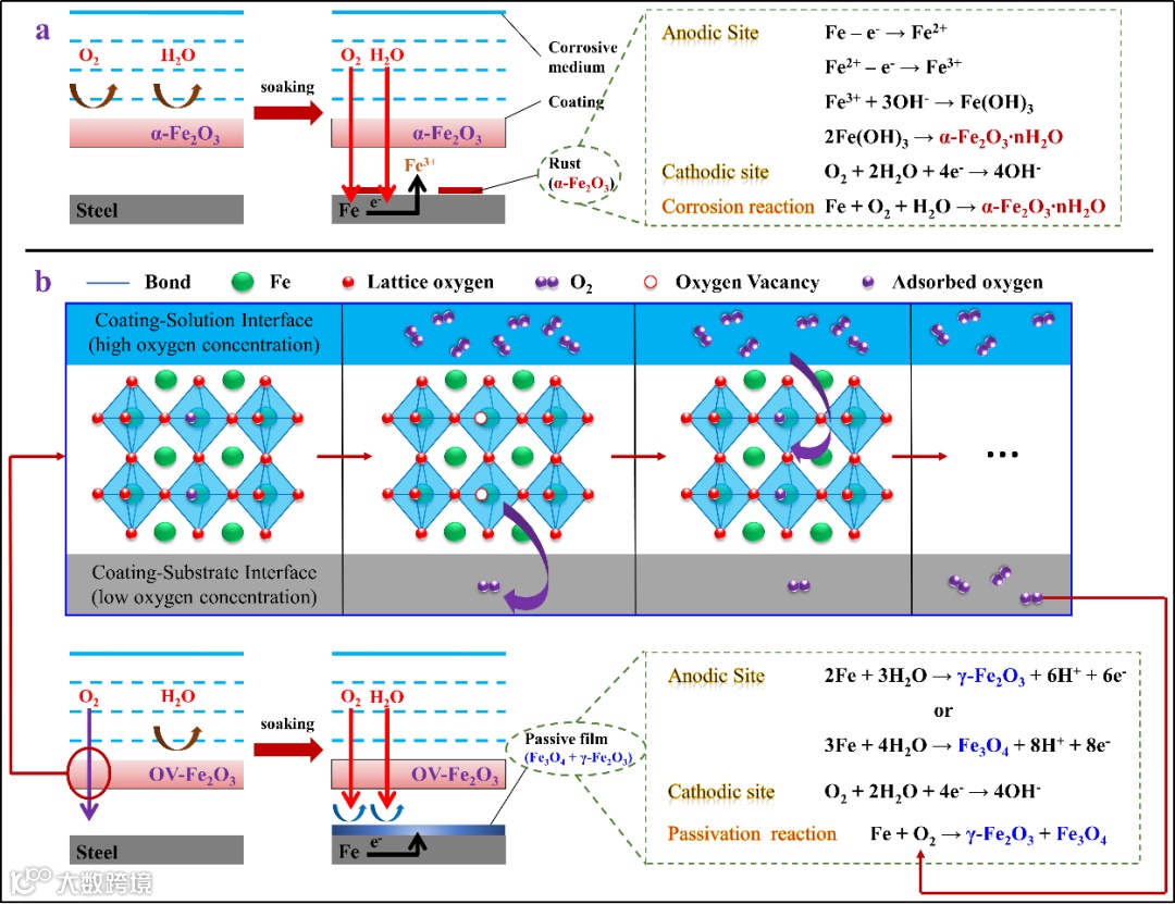 在这项工作中,利用溶剂合成方法和低温煅烧成功制备表面富含氧空位的α-Fe2O3纳米材料,并将其作为填料添加进环氧树脂中形成致密的涂层。在其他腐蚀性介质穿透涂层之前,氧气分子可以被氧空位拆解为氧原子并依靠氧浓度梯度迅速向下传输,优先转移到碳钢表面。这一过程增加了OV-Fe2O3涂层和基底之间界面处的氧浓度,而氧浓度的增加可以促进金属阳极反应从活性溶解((Fe → Fe2+ + 2e-)向钝化(3Fe + 4H2O → Fe3O4 + 8H+ + 8e- or 2Fe + 3H2O → γ-Fe2O3 + 6H+ + 6e-)过渡。作为钝化产物的γ--Fe2O3晶体结构致密,可以紧密排列形成防止腐蚀性介质进一步入侵的钝化膜。由于涂层-金属基板界面是缺氧环境,储存在OV-Fe2O3空位中的氧原子可以将向基材扩散。此外,由于氧浓度梯度的存在,OV-Fe2O3填料可以源源不断地从涂层表面捕捉氧气并储存起来。这一工作有望为制备高钝化性能的防腐涂料提供新思路,以及拓宽氧空位材料的应用领域,促进多领域跨学科交叉融合发展。