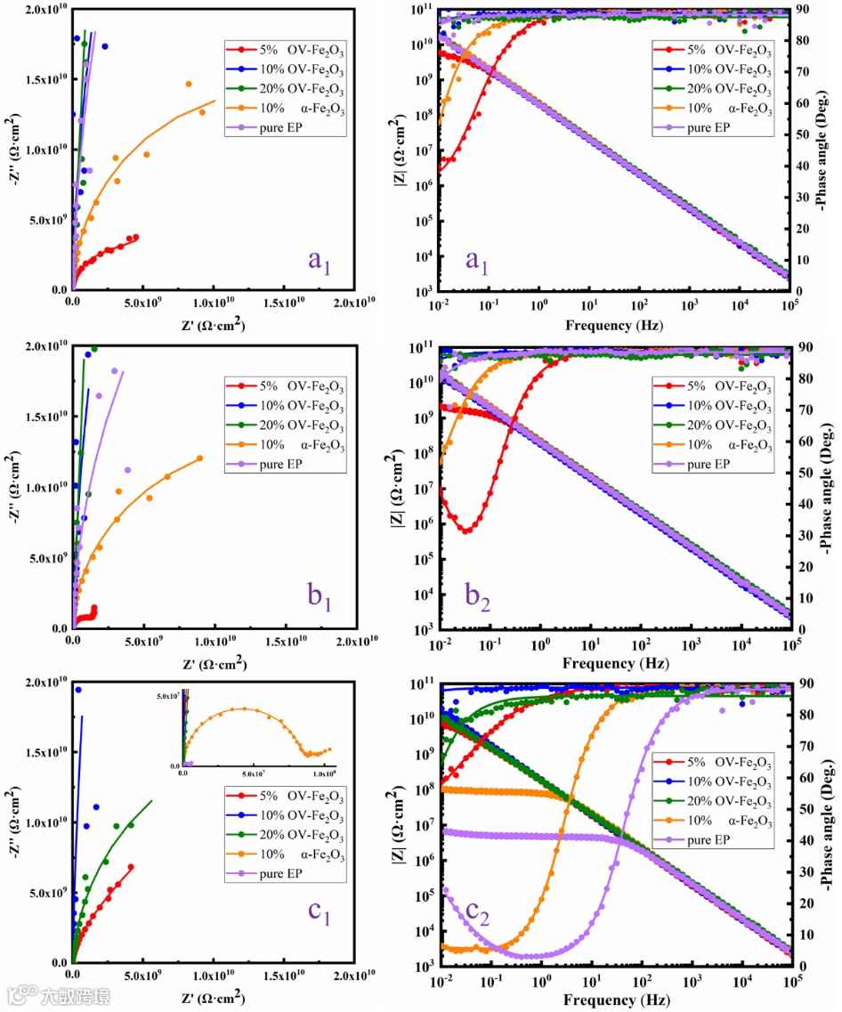 针对上述问题,汪怀远教授团队提出通过调控纳米材料氧空穴以实现涂层防腐调控的新策略,制备一种纳米材料表面含有大量氧空位的环氧复合涂层。采用喷涂技术成功制备一种同时具备物理阻隔性能与选择性传输氧气性能的新型高效钝化型防腐涂层。通过前期文献调研及实验条件摸索,作者发明了通过溶剂还原法,辅以煅烧,一步制得表面富含氧空位的α-Fe2O3(以下简称OV-Fe2O3)纳米材料,制备工艺简单,合成路线绿色环保。将OV-Fe2O3填料加入到双酚F51环氧树脂中,利用氧空位对氧气的浓度梯度感应,选择性地将氧气从浓度较高的腐蚀性介质-涂层界面搬运到氧浓度较低的涂层-基板界面,从而实现在腐蚀性介质到达基板之前完成对金属基底的钝化。最终,在90℃、2MPa纯氧环境下,OV-Fe2O3涂层在3.5wt% NaCl溶液中浸泡48h后,填料含量为10wt%的涂层的阻抗模量仍在1010Ω·cm2以上,是相同条件下以普通α-Fe2O3作为填料的涂层阻抗的107倍。