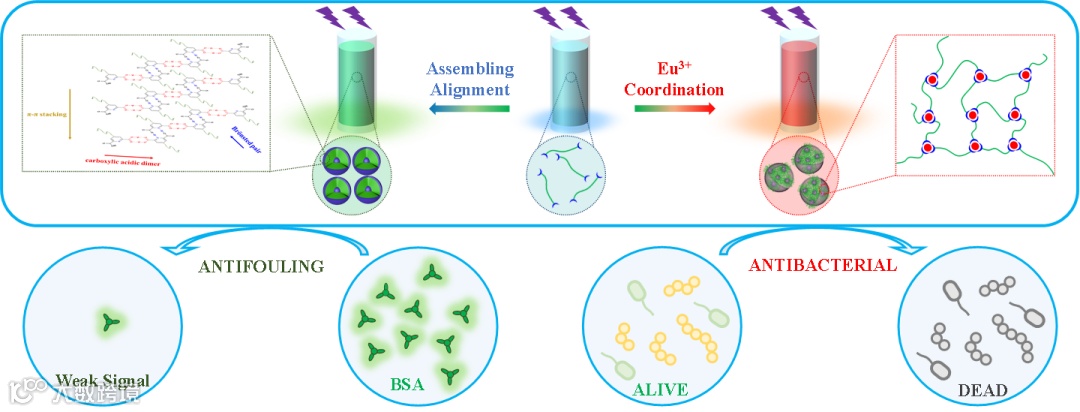 作者指出,在络合Eu3+后,聚合物能够发射显著的红色荧光,且其在水溶液中未发生荧光淬灭,经荧光光谱分析配位还可以通过天线效应增强中心离子的荧光。这种材料具有显著的抗蛋白性能与良好的抗菌性能,有望制备一种新型的荧光生物涂层并运用于生物医用领域。