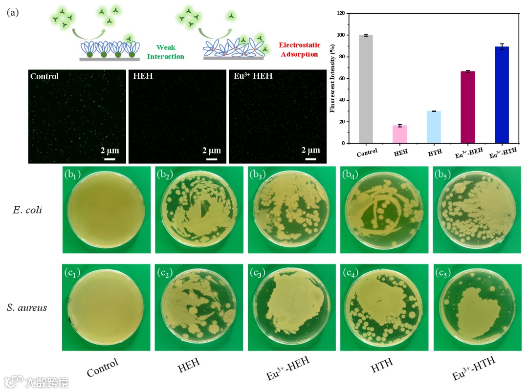 图5 (a) 空白样,HEH与Eu3+-HEH membranes抗BSA蛋白粘附性的CLSM测试图像对比与相关的荧光强度统计图以及样品抗蛋白机理示意;空白样, HEH, Eu3+-HEH, HTH 和 Eu3+-HTH 采用平板涂布法针对 (b1-b5) E. coli 和 (c1-c5) S. aureus的抗菌测试