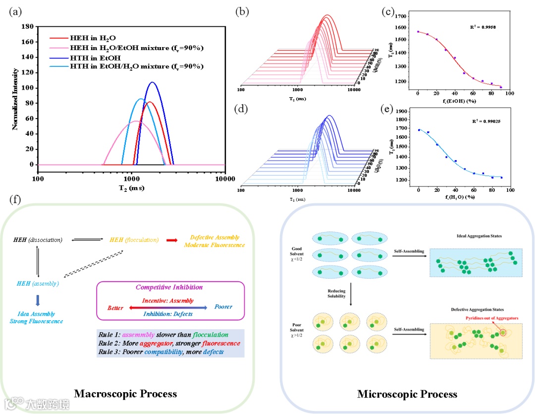 图4 (a) HEH在H2O, H2O/EtOH (fv=90%)与HTH在EtOH,EtOH/H2O (fv=90%)中的T2谱对比;随着劣溶剂体积分数fv(poor solvent)变化(b) HEH与 (d) HTH的归一化T2谱瀑布图以及 (c) HEH与 (e) HTH关于fv(poor solvent)和T2 之间的Boltzmann 拟合曲线; (f) HEH 与HTH在不同极性溶液中的缺陷聚集机理与导致其产生的竞争性抑制动力学过程的宏观-微观示意图