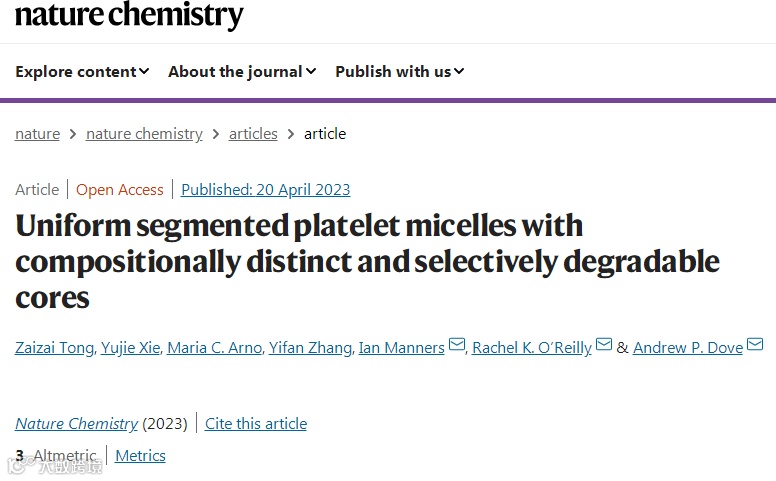 该论文系统探索了嵌段共聚物异质附生生长的机理,深化了结晶驱动自组装微观机制的认识,对构筑其它多组分、多功能集一体的高分子二维纳米材料及其功能构造具有重要的指导作用和科学意义,如共轭高分子异质结的构建。文章以“Uniform segmented platelet micelles with compositionally distinct and selectively degradable cores”为题发表在《Nature Chemistry》上,DOI: 10.1038/s41557-023-01177-2。该研究得到了国家自然基金(22273087)、国家留学基金委、浙江理工大学和伯明翰大学的支持。