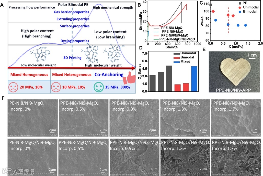 另外,该团队通过共锚定策略,可以实现异相双活性中心镍催化剂的制备,从而用于制备具有良好机械性能的双峰极性官能团化聚烯烃(图5A)。与单峰极性官能团化聚烯烃相比,这类双峰产物在兼顾良好的机械性能(图5B)的同时,还可以实现良好的亲水性(图5C)、阻隔性(图5D)和3D打印性能(图5E)。与机械共混法相比,原位聚合法得到的双峰聚合物釜内合金可以实现更加均匀的分散效果(图5F)。