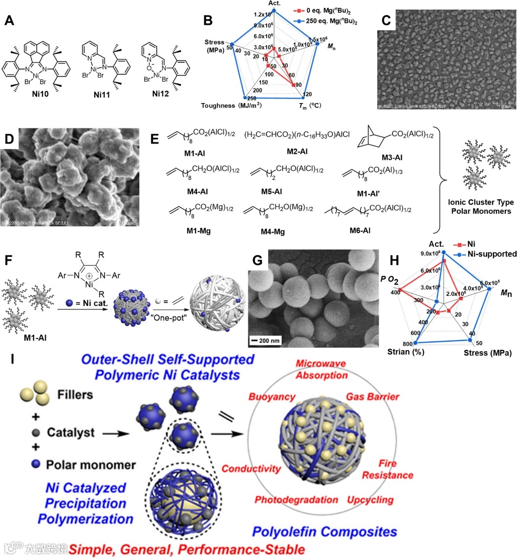 尽管上述策略具有诸多优点,但它们都需要合成含有锚定基团的金属配合物,从而增加了催化剂的合成难度和成本。最近,该团队利用助催化剂原位沉淀反应(图6A、6C、6D)、离子簇型极性单体的沉淀(共)聚合反应(图6E、6F)等策略,实现了将不含锚定基团的镍催化剂原位地转化为异相催化体系,从而实现了聚合反应产物的形貌控制(图6G)。这些策略同时还可以实现聚合产物的材料性能的提升(图6B、6H)。不仅如此,离子簇极性单体策略还可以实现大幅提升烯烃-极性单体共聚的活性、插入比、热稳定性,并且甚至还可以实现极性单体的配位均聚反应。基于离子簇型极性单体策略,还可以制备各类填料复合型异相镍催化剂,用于乙烯淤浆聚合法原位制备各类聚乙烯基功能复合材料(图6I)。与传统的熔体共混法相比,原位聚合法可以实现更好的填料分散性,从而显著提升复合材料的性能。