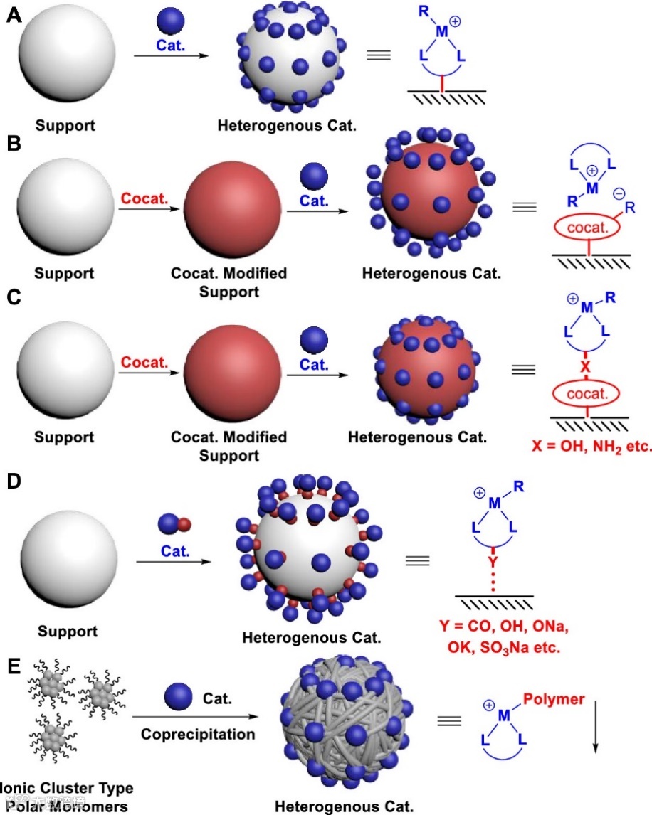 图2 不同的异相化策略。(A)通过共价键负载。(B)通过助催化剂改性和离子对的形成而负载。(C)通过反应性锚定基团负载。(D)通过氢键或离子锚定基团负载。(E)通过离子簇型极性单体的沉淀配位聚合原位负载。