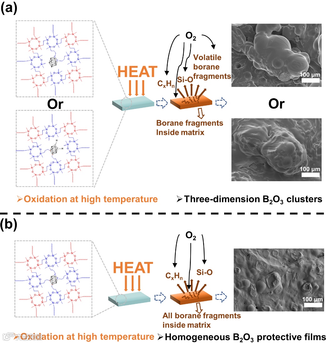 碳硼烷改性高分子材料由于其优异的耐温性能和功能性而在航空航天、汽车工业、医疗等领域具有广泛的应用前景,是面向极端环境应用的高分子材料重要组成部分。传统的碳硼烷改性高分子材料是基于对碳硼烷的C-H键功能化,通过强碱有机锂试剂与碳硼烷笼上的C-H键的亲核取代可以生成具有多种功能化可能性的碳硼烷锂盐中间体。将碳硼烷引入高分子体系中,可以将高分子材料的耐温性能提高50-100 °C。其中最具代表性的为碳硼烷-硅氧烷共聚物,以间-碳硼烷-硅氧烷共聚物为例,其中碳硼烷与硅氧烷的连接多通过C-Si键或C-C键,此类聚合物能够在450 °C下具有短时稳定性。然而,传统的C-H修饰碳硼烷在450-500 °C其笼结构会瓦解,生成高毒性硼烷并溢出。随着应用环境越来越苛刻,传统的C-H修饰碳硼烷改性高性能高分子材料已经不能满足需求,如何抑制碳硼烷笼状结构高温瓦解与硼烷溢出是未来碳硼烷改性高分子材料应用亟待解决的问题之一。