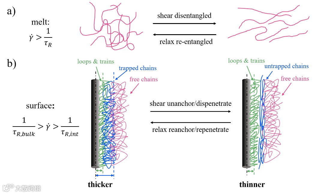 图5. a) 纯聚合物熔体剪切诱导解缠结/重新缠结的示意图。b) 示意图:在剪切与松弛过程,纳米纤维界面层出现剪切诱导解缠结、解吸附过程,与此同时,该界面层出现松弛导致的重新缠结、重新吸附过程,这两种过程共同决定纳米纤维的有效流体力学直径。