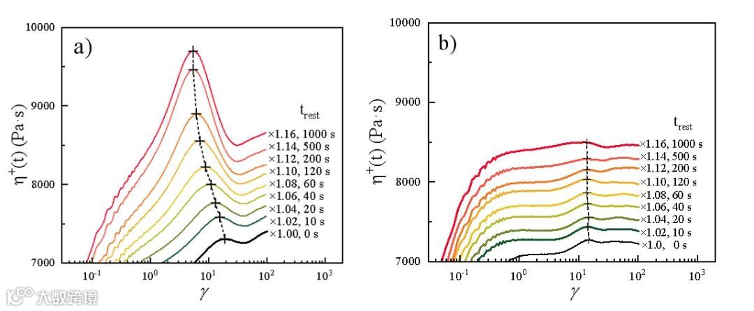 图4. a) 反向剪切过程中的粘度过冲峰应变γovershoot;b) 反向剪切过程中的粘度过冲强度ηovershoot/ηsteady 。