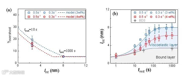 图6. (a) 粘度过冲应变γovershoot与有效流体力学界面层厚度ιint的关系。(b) 停止剪切后,PLA/NF复合体系中纳米纤维界面层厚度的回复过程。