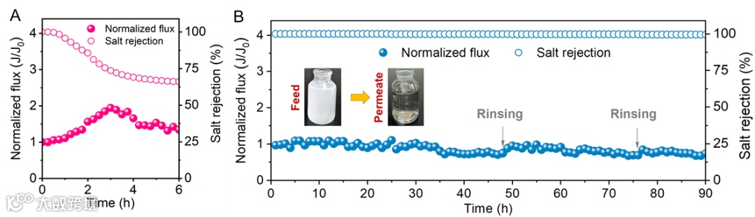 如图3所示,PVA/TA涂层复合后,膜表现出致密的表面形貌、增大的液体进入压力(LEP,1.01 ± 0.02 MPa)和抑制的表面活性剂(SDS)扩散,这将有利于复合膜的抗润湿性能。此外,PVA/TA类水凝胶涂层赋予复合膜与原膜相反的润湿特性,在空气中高亲水、在水下超疏油,能够抵抗油类物质的污染。因此,当处理含3.5 wt% NaCl、1000 ppm矿物油和0.1 mM SDS的溶液时,类水凝胶Janus MD膜展现出了稳定的渗透通量和接近100%的截盐率,能够稳定运行90 h,大大增强了MD膜的服役性能(图4)。