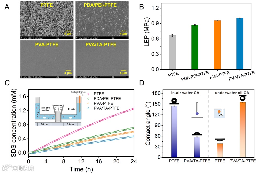 图3膜的形貌结构、液体进入压力、表面活性剂扩散和润湿特性