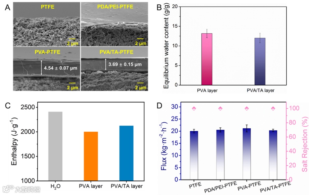 近期,山东大学环境科学与工程学院王志宁教授团队制备了聚乙烯醇/单宁酸(PVA/TA)类水凝胶Janus MD膜,用于膜蒸馏过程的高效抗润湿、抗污染。首先,在疏水微孔膜表面采用仿生粘合策略构筑聚多巴胺/聚乙烯亚胺(PDA/PEI)中间层,以增强后续亲水功能层与疏水支撑层之间的相容性与结合力。然后,采用“刮涂-干燥收缩-再水合”工艺,并引入TA作为氢键增强剂,构筑了PVA/TA Janus MD膜(图1)。这一工艺简单温和、绿色环保,有利于放大生产。得益于PVA/TA涂层类似于水凝胶高平衡水含量和低蒸发焓的特性,微米级厚度涂层的引入,依然保障了膜蒸馏过程的高渗透通量(图2)。