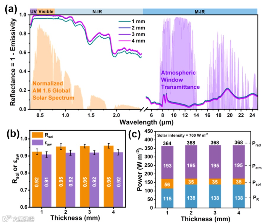 图2. (a) 辐射/蒸发制冷水凝胶的太阳辐射反射光谱和大气窗口发射光谱,及其 (b) 太阳辐射透射光谱和 (c) 理论辐射制冷功率。图2. (a) 不同厚度(1 - 4 mm)的无水型NPs/NADES@PAAm/PVA的反射率和发射率光谱和 (b) 相应的太阳反射率 (Rsol) 和大气窗口的辐射率 (εaw)。(c)不同厚度的辐射功率(Prad)、大气辐射吸收功率(Patm)、太阳辐射吸收功率(Psol)和净辐射制冷功率(PR)。