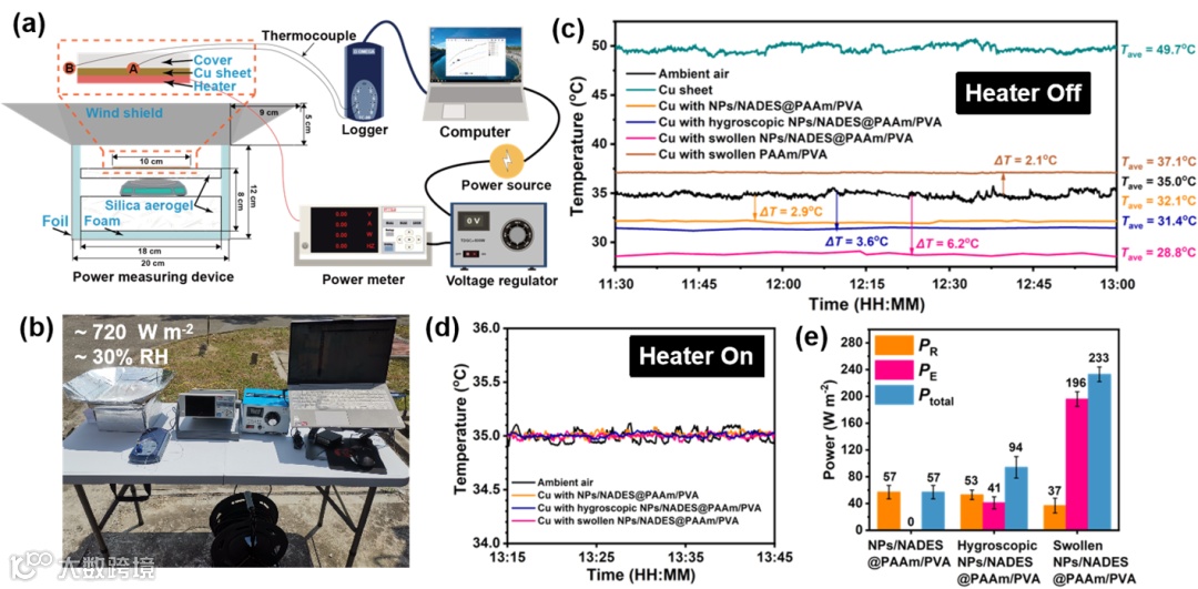图4. (a) 无水型、溶胀型和吸湿型NPs/NADES@PAAm/PVA的制冷功率测量设备示意图。(b)太阳辐射强度为~720 W m-2和相对湿度为~30%条件下的实验实景图。 (c) 不同处理的铜片表面温度变化 (加热器关闭)。(d) 不同处理的铜片表面温度变化 (加热器开启)。(e) 无水型、溶胀型和吸湿型NPs/NADES@PAAm/PVA的平均蒸发制冷功率、日间辐射制冷功率和总制冷功率。