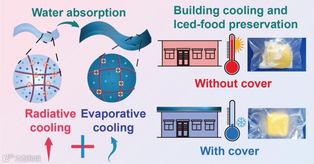 图1. 具有日间辐射/蒸发效应的纳米复合水凝胶在建筑冷却和冷冻食品短途运输的潜在应用。