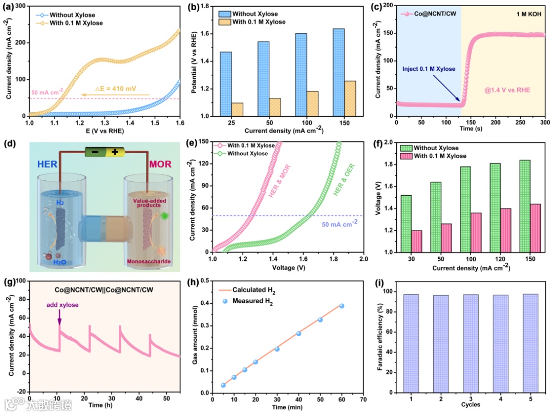电催化水分解装置面临的一个主要挑战是OER的动力学迟缓,消耗大量的电力。生物质氧化与HER耦合是一种有效的替代传统电解水制氢策略,能够降低制氢成本。选择单糖氧化反应(MOR)作为阳极OER替代反应, Co@NCNT/CW对MOR比OER具有更高的催化活性,电流密度达到50 mA cm-2,过电位显著降低(1.13 V vs 1.54 V)。由Co@NCNT/CW催化剂作为阴极和阳极处的电极组装杂化水电解系统,Co@NCNT/CW || Co@NCNT/CW电解槽仅需1.36 V的电池电压可在100 mA cm-2电流密度下生产H2,比传统水分解装置所需电压低420 mV。此外,连续运行的水电解系统表现出优异的催化稳定性,且具有较高的析氢法拉第效率,阳极处木糖转化率高达97.3%,这凸显了该策略在节能制氢和绿色合成高附加值化学品方面的概念优势。