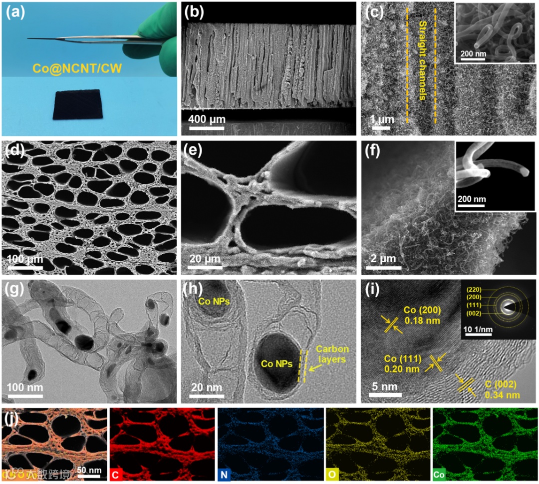 在CW的每个垂直通道上都被Co@NCNTs完全覆盖,交错的Co@NCNTs在CW的孔隙中均匀生长,形成一个整体的分级多孔结构。得益于低弯曲度和分级多孔结构,电解质可以渗透到Co@NCNT/CW的孔隙中,有利于催化剂表面产生的气体从分级多孔中释放,保证了传质途径。此外,Co@NCNTs在CW内部的孔隙上高度均匀集成,可以提供连续快速的电子传输路径。将N原子引入碳材料中,可以进一步调节相邻C原子的电子结构,诱导界面处电荷重分配,从而激发C位点的催化活性。