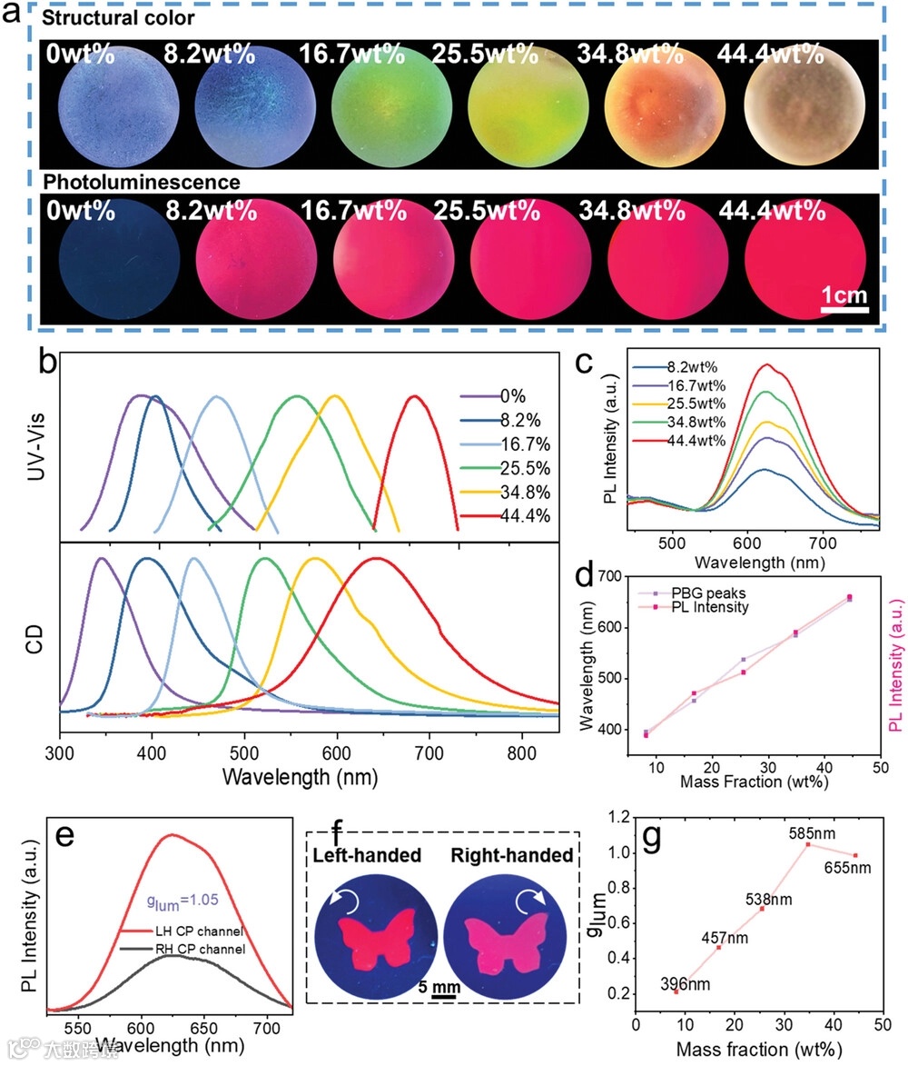 近日,四川大学卢灿辉教授、熊锐特聘研究员和福建师范大学卢至行讲师受生物体(如甲虫和萤火虫)利用圆偏振光对复杂生物信息进行加密的启发,报道了一种基于纳米纤维素(CNC)和金纳米团簇(bioAuNCs)手性光子结构的多通道手性光学生物标签。CNC是一种天然可再生的棒状纳米材料,具有丰富表面基团、良好生物相容性、生物降解性、低成本等特性,能够自组装成具有左旋手性向列结构的彩色薄膜。bioAuNCs作为客体发光材料,通过一维核壳自组装固定在CNC表面,然后共组装成手性向列相纳米结构。所得到的复合标签携带五种光学信息,能够实现相互独立的多通道防伪加密。