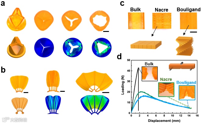 人体及各类生物组织通常都为软硬复合结构。此类复合仿生结构的一体化成型一直是3D打印的一大难点。图三展示了该工作在此类应用上的实用示例。定制化快速打印具有解剖结构与机械性能的心脏瓣膜高仿真模型,可以帮助医生对植入体进行术前临床模拟研究。仿生鱼鳍结构可以打印出坚硬的鱼骨和可开合的肌肉,可用于各类仿生机器部件。同时可以通过该技术打印层状贝壳珍珠母(Nacre)或者纤维布利冈(Bouligand) 等工程仿生复合结构,帮助研究其强韧机制。