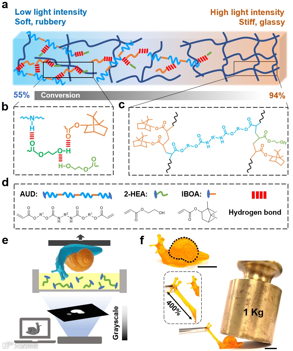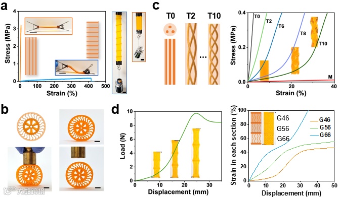 在低转化率下,有机单体在氢键作用下和共价交联网络形成稳定的高拉伸(~1500%)低模量(~0.01MPa)有机凝胶软材料。同时又能在完全反应的情况下转化为模量高达480MPa的硬质聚合物。灰度数字光处理技术则实现了对打印结构力学特征在50微米尺度的像素级精确调控。如图一所示,基于该技术打印的蜗牛,不仅能实现结构形状的高精度复制,还能还原其不同结构的力学特征:柔软可拉伸的身体和坚硬的外壳。基于该打印技术,作者展示了其在过去无法通过单次打印一体成型的各类复杂结构及器件制造上的可行性。