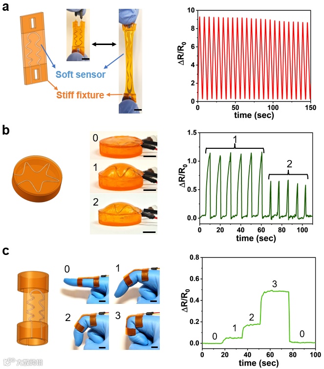 文章展示了该技术在各类可交互,可穿戴的电子器件及传感器制造上的应用。在器件结构中打印微孔并注入液态金属,可实现对包括应变、压力、穿戴式等各类传感器的高度定制化打印。