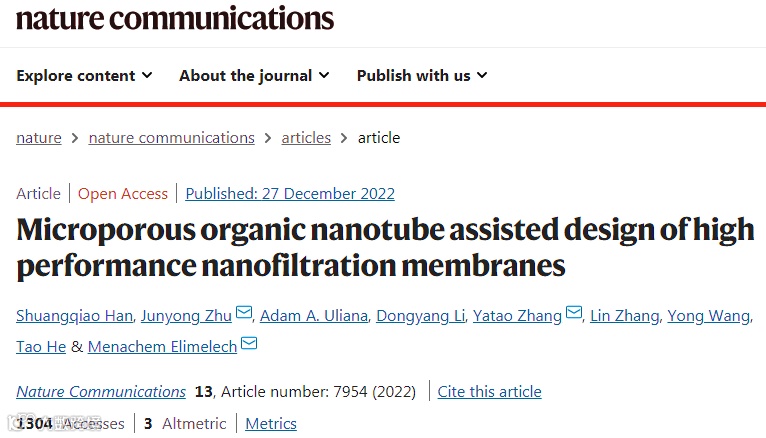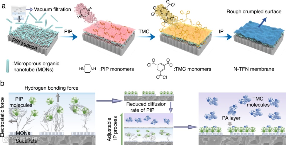 微孔有机纳米管 (MON) 因其具有高微孔率、可定制的化学结构和良好的聚合物亲和力等特性,有望用于构建高渗透纳滤膜。近日,郑州大学化工学院张亚涛教授团队在微孔有机纳米管用于膜分离技术领域取得新进展。提出共价有机骨架衍生的 MON(NT-OEt)调控界面聚合策略以改善聚酰胺纳滤膜性能,实现了快速、精准离子筛分。分子模拟结果表明,引入 MON 不仅延缓二胺分子向水/油界面的扩散,而且改善了膜孔周围水分子的密度。NT-OEt有机纳米管可显著提升纳滤膜的分离性能,并且在碱性条件下对硼和磷有较高的去除率。博士生韩双乔为第一作者,张亚涛教授、朱军勇副教授和耶鲁大学Menachem Elimelech教授为通讯作者。此研究得到国家自然科学基金、河南省杰出青年科学基金等项目支持。