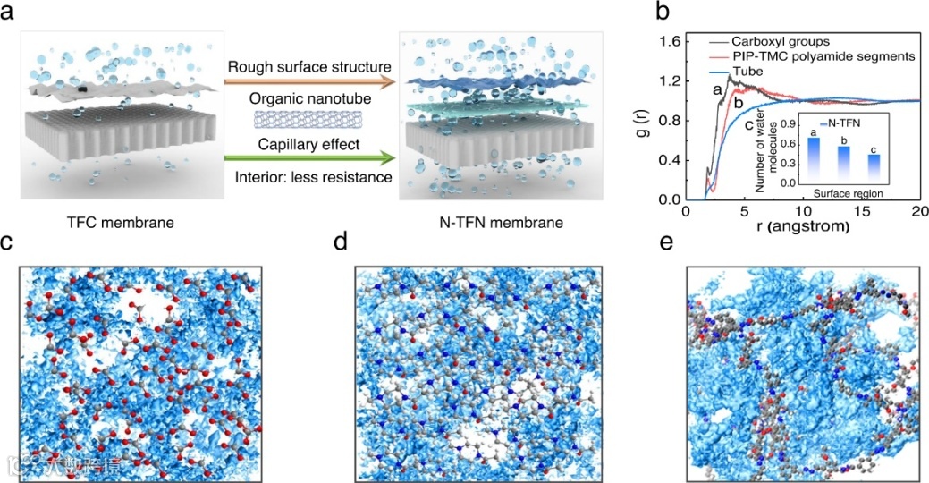 NT-OEt 纳米管可以通过延缓单体扩散速率来调控界面聚合反应。通过分子动力学模拟来验证聚酰胺膜的物理化学结构和分子传输特性之间的关系。MD模拟显示TFC和N-TFN膜的平均孔径分别为0.29和0.37 nm。模拟和实验结果均证实N-TFN膜比TFC膜具有更高的自由体积和孔隙率。此外,探究了水分子在聚酰胺膜中的传输特性。N-TFN膜中的羧基、PIP-TMC聚酰胺片段和有机纳米管片段作为水分子运输位点。根据径向分布函数结果,三个分子位点附近每个官能团的水分子数分别为0.72、0.58、0.46。这说明有机纳米管的引入不仅增加了水分子传输位点,而且还增加了水分子在膜上运输的数量。