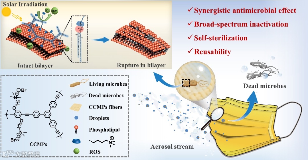 陕西师范大学唐艳丽课题组长期致力于新型共轭聚合物的设计合成及其在抗菌/抗肿瘤治疗等生物医药方面的应用研究。共轭聚合物由于其具有良好的光敏特性和生物相容性,在抗菌材料的应用上显示出了巨大的潜力。近期,该课题组设计合成了一种阳离子共轭微孔聚合物CCMPs,通过简单地将反应液喷涂至口罩表面,控制一定的反应条件,反应单体可以在口罩纤维表面原位聚合形成均匀的CCMPs涂层。CCMPs涂层的抗菌机理如图1所示:一方面,CCMPs骨架上修饰了大量的季铵盐侧链,这些带正电的季铵盐基团可以与表面带负电的微生物紧密结合,破坏微生物膜的完整性,使内容物外流,导致微生物死亡;另一方面,CCMPs具有延长的共轭骨架结构,其作为一种高效的光敏剂,可以在光照下产生大量的活性氧物质,对微生物造成不可逆的损伤。在实际应用中,CCMPs涂层可以在太阳光照射下实现优异的光动力和接触式双重抗微生物模式,而在光照较弱或黑暗状况下,CCMPs涂层可以利用接触式抗菌实现良好的抗菌效果。该工作为未来抗菌型防护用品特别是抗菌型口罩的开发提供了新的思路。相关工作以“Cationic Conjugated Microporous Polymers Coating for Dual-modal Antimicrobial Inactivation with Self-Sterilization and Reusability Functions”为题发表在《Advanced Functional Materials》上(Adv. Funct. Mater. 2023, 2213440)。