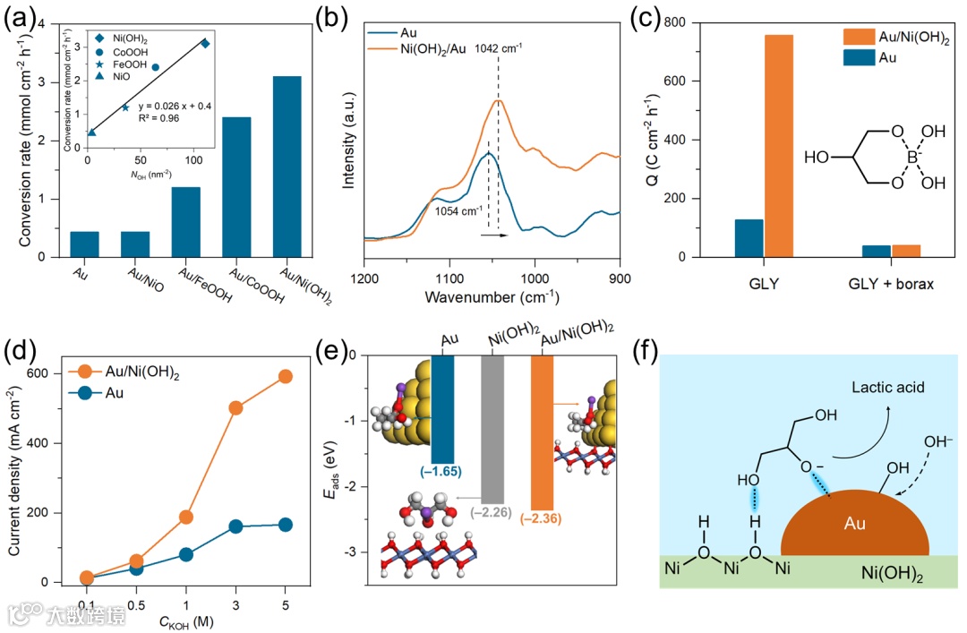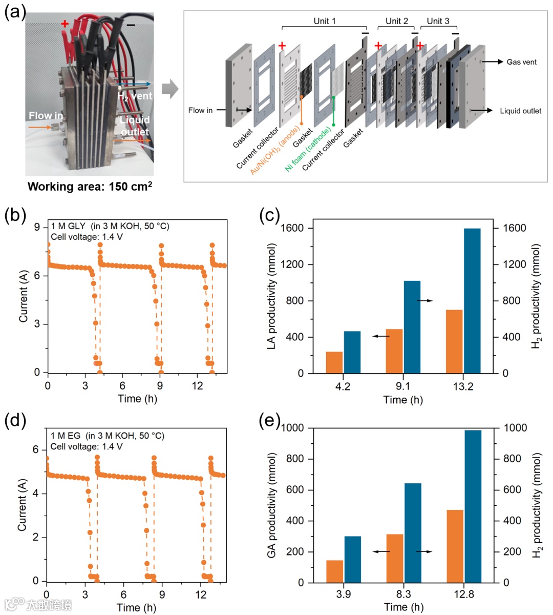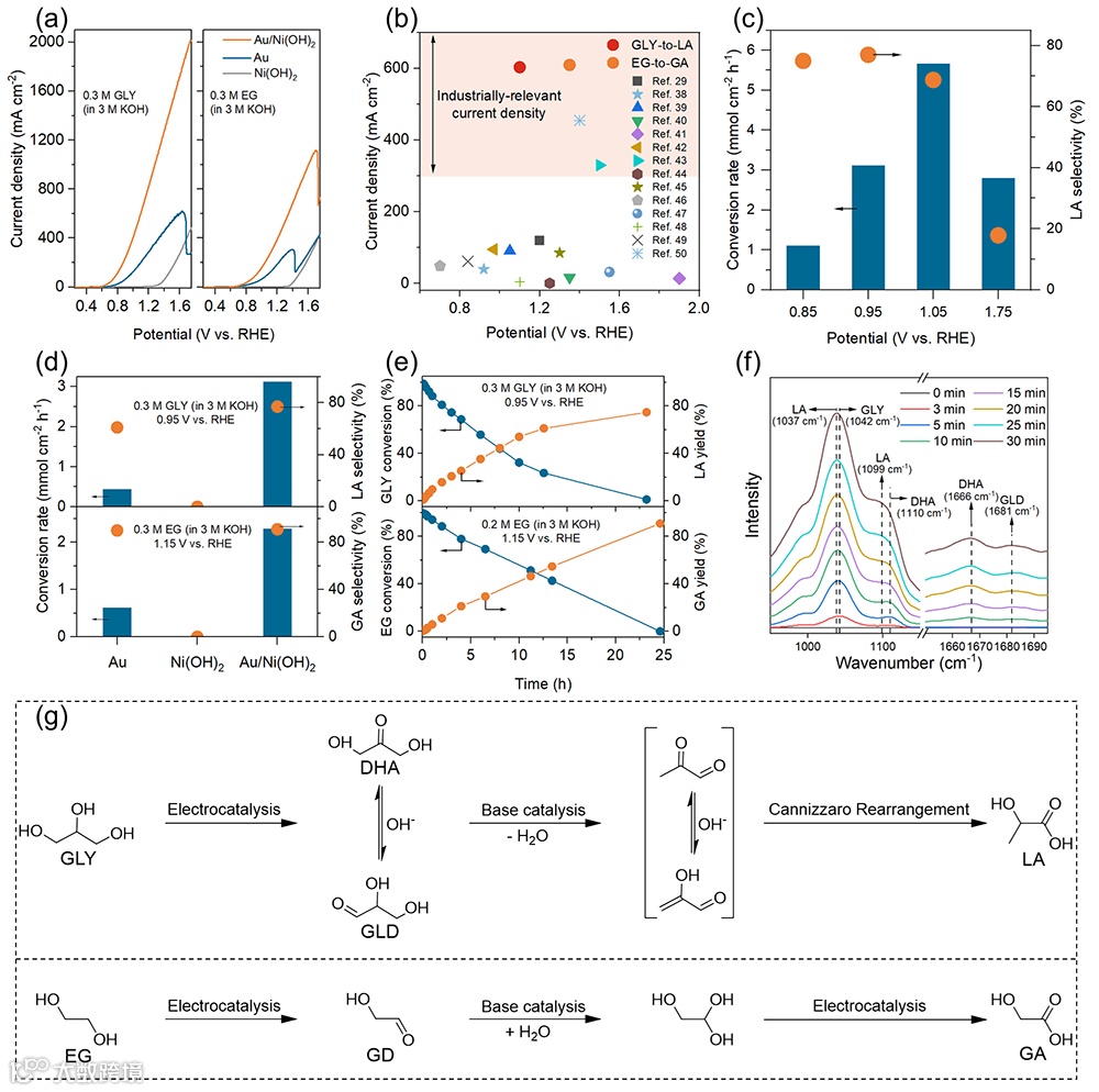 以可再生电能为驱动力的电解水制氢耦合催化氧化技术为实现生物质和废塑料的高值转化提供了一条绿色新途径,在制备高值含氧化学品的同时联产绿氢,最近受到科研界和企业界的广泛关注。然而,目前电催化甘油、乙二醇氧化的产物仍以C−C键断裂的甲酸(盐)为主,经济附加值较低。虽然已有文献报导了电催化甘油、乙二醇制备乳酸以及乙醇酸,但仍面临电流密度低的问题(难以达到工业生产需求;>300 mA cm−2),且法拉第效率(FE)和产物选择性仍有待进一步提高。因此如何实现在高电流密度下将甘油、乙二醇高选择性转化为乳酸、乙醇酸是当前科研人员面临的一个重要挑战。