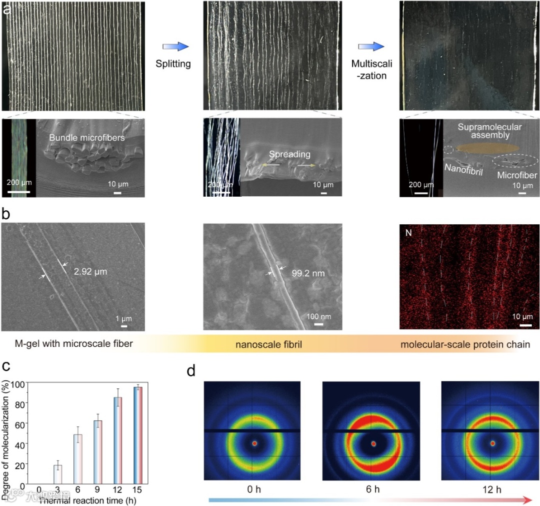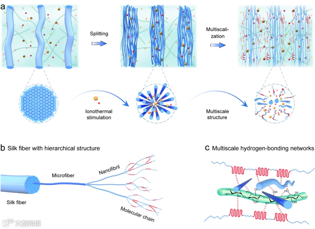 木质纤维素与丝素纤维都是人们熟知的天然高分子聚合物,纤维素分子链上丰富的羟基结构赋予其多元化的氢键拓扑网络构效设计,丝素纤维作为一种宏观上强韧的纤维材料得益于其微观上独特的蛋白质多尺度结构,高度结晶的β折叠构象赋予其优越的刚度和韧性。因此可以在分子尺度调控设计两种天然高分子物质,赋予材料更新颖、更强大的性能。