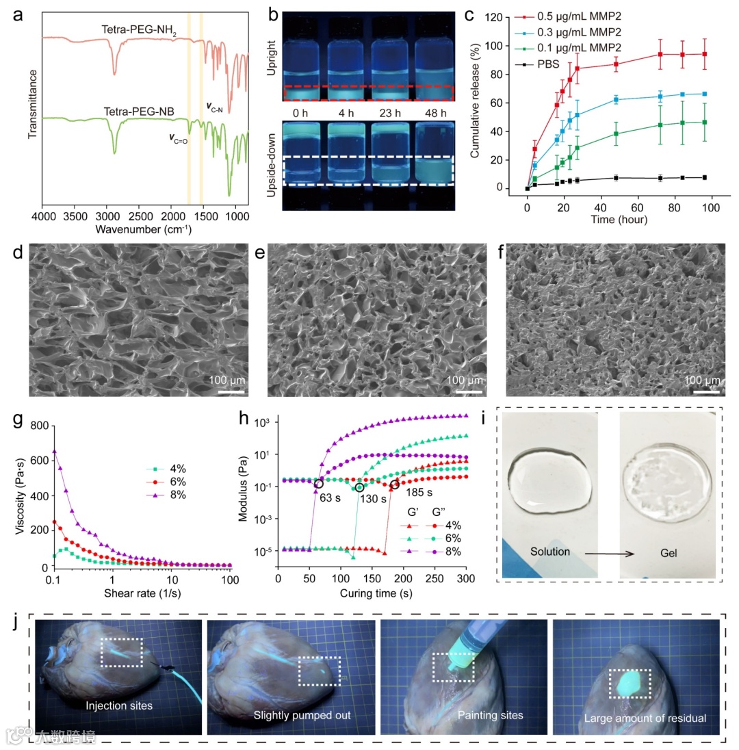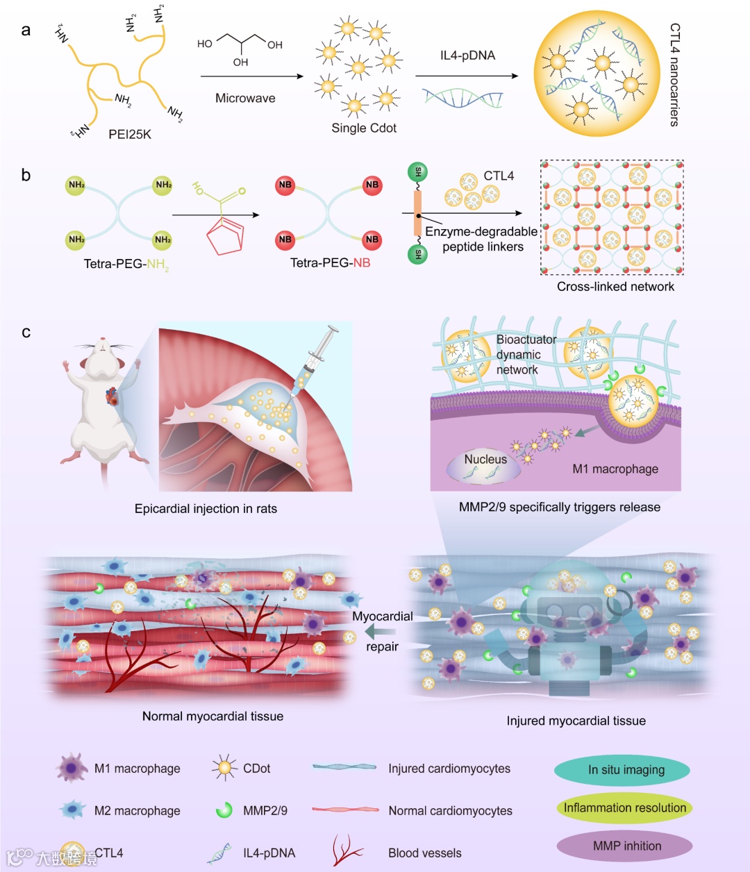 心梗早期炎症微环境中,巨噬细胞扮演了重要角色,大量促炎巨噬细胞的生成进一步加剧了梗死微环境中的炎症反应和心肌凋亡。如何促进在清除微环境中活性氧的同时,进一步调控促炎巨噬细胞向抗炎巨噬细胞的转型极化,对于心肌后期重塑与修复至关重要。军事医学研究院周瑾教授,王常勇教授团队在前期的工作中,利用天然黑色素/海藻酸水凝胶(MNPs/Alg)支架材料通过调控巨噬细胞转型实现了对心梗早期炎症、抗氧化微环境的纠正和调整,并证实了支架材料可以通过调控巨噬细胞实现对心梗的修复(Adv. Sci. 2021,8, 21005)。近期,他们团队进一步针对巨噬细胞转型的调控,通过大量带正电荷的PEI25k的表面钝化策略,设计制备了一种可负载IL4-pDNA的碳点基因纳米载体(CTL4)。CTL4可促进促炎型的M1巨噬细胞极化为抗炎型的M2型巨噬细胞、降低炎症反应,同时可实现原位荧光成像,观察巨噬细胞对CTL4的摄取。此外,该团队进一步设计了基质金属蛋白酶(MMP)响应性的四臂聚乙二醇(MPG)水凝胶。CTL4通过可控制的光聚合过程被封装在MPG网络中制成MPGC4水凝胶递送系统。粘弹性的MPGC4网络由巯基和烯烃的点击反应来交联,其表现出剪切变烯的特性,可以很容易地注射到梗死区,并能打印出各种形状的水凝胶支架。