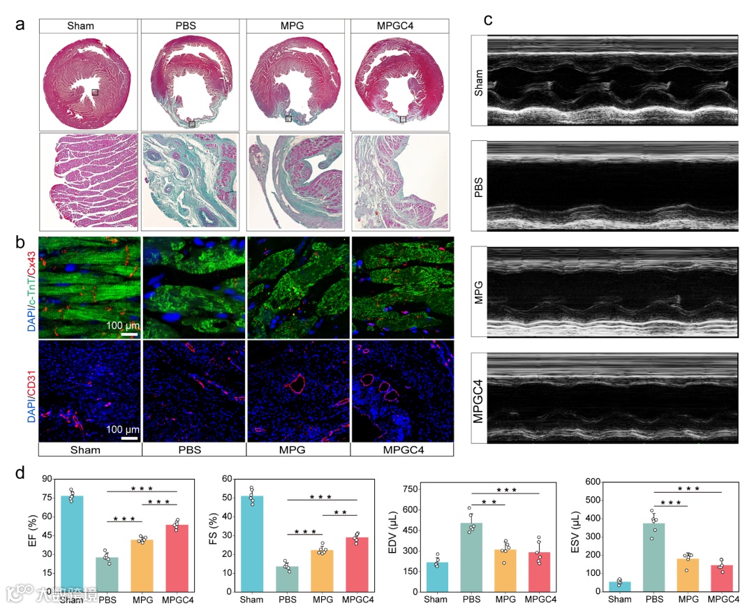 将制备的MPGC4水凝胶注射到大鼠心梗部位,研究发现MPGC4可被心肌梗死后高表达的MMP自动触发,在响应并清除心梗区域的MMPs的同时按需释放CTL4,释放出的CTL4可有效促进梗死早期M1型巨噬细胞向M2型巨噬细胞的转型,起到抗炎的作用,并促进心肌细胞免受炎性因子的损伤,从而保护心肌细胞的活性。进一步利用Masson、免疫组织化学染色、小动物心脏超声等方法综合评价了MPGC4水凝胶递送系统的治疗效果。研究表明,这种功能性的水凝胶递送系统可以增加心梗区域缝隙连接的形成,促进损伤组织血管化,显著降低心梗后的纤维化程度,并伴随左心室壁的厚度显著增加,提高射血分数,有效提升梗死后的心脏功能。