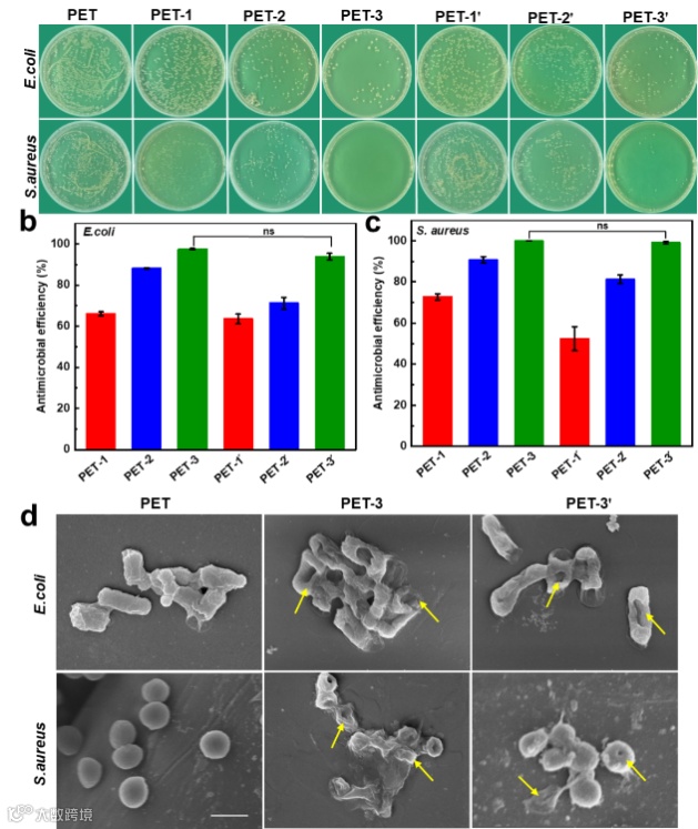 (2)抗菌PET织物的杀菌性能(图3)。研究表明,PEI分子量的大小和PEI-PET织物的杀菌性能呈正相关。其中优选的PET-3对大肠杆菌和金黄色葡萄球菌的杀菌效率达到97.5%和99.9%。接枝BF后,织物的杀菌效率有不同程度的下降,但是织物PET-3'对大肠杆菌和金黄色葡萄球菌的杀菌效率分别保持在93.5%和99.1%,与织物PET-3没有显示出统计学差异(p>0.05)。SEM表征结果显示:接触杀伤是PET-3'织物发挥抗菌功能的主要方式。