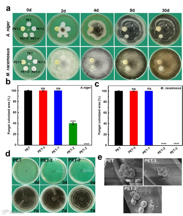 (4)抗菌PET织物的抗真菌粘附性能(图5)。研究表明,在第30天PET和PEI-PET织物被黑曲霉菌或总状毛霉完全覆盖,而PET-3'织物表面仍保持干净。主动接触实验(图5a-c)说明,BF的引入赋予了织物良好的抗真菌污染性能。结合被动接触实验(图5d,e),表明PET-3'织物仅对真菌孢子起抑制作用。