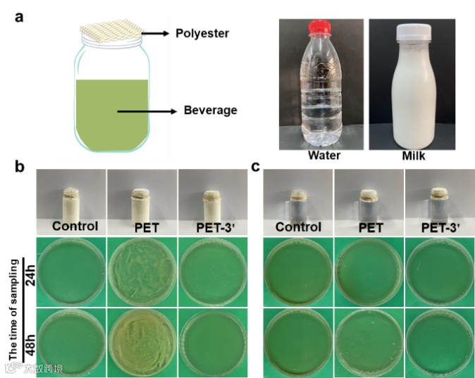 食品贮藏:以织物作为封口材料,对水和牛奶介质的保质实验(图7)表明,存放48小时后,PET-3'织物组的细菌菌落数显著低于PET组,存在统计学差异。这一现象表明,PET-3'织物能够有效阻止环境微生物进入容器中,从而延长食品的保质期。因此,抗菌织物PET-3'在食品包装领域具有潜在的应用价值。