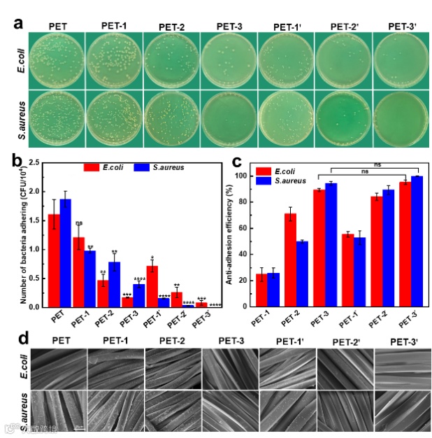 (3)抗菌PET织物的抗细菌粘附性能(图4)。研究表明,PEI-PET织物的抗粘附性能和PEI的分子量相关,其中PET-3对大肠杆菌和金黄色葡萄球菌的抗粘附效率分别达到89.3%和94.3%。在BF接枝之后,PET织物都表现出更高的抗粘附效率,其中PET-3'对大肠杆菌和金黄色葡萄球菌的抗粘附效率分别达到95.1%和99.3%。SEM结果表明,PET-3'织物表面几乎没有粘附的细菌。因此,PEI和BF的结合赋予了PET织物良好的抗细菌粘附性能。