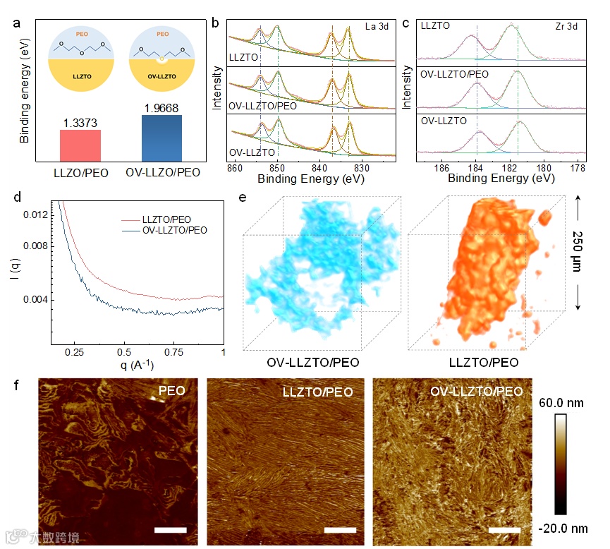 图2. (a)PEO和LLZZTO/OV-LLZTO的结合能计算及氧桥接界面机理图;(b,c)复合膜的XPS表征结果;(d)复合膜的SAXS测试;(e) CT扫描得到的复合膜三维结构;(f)复合膜的AFM形貌图