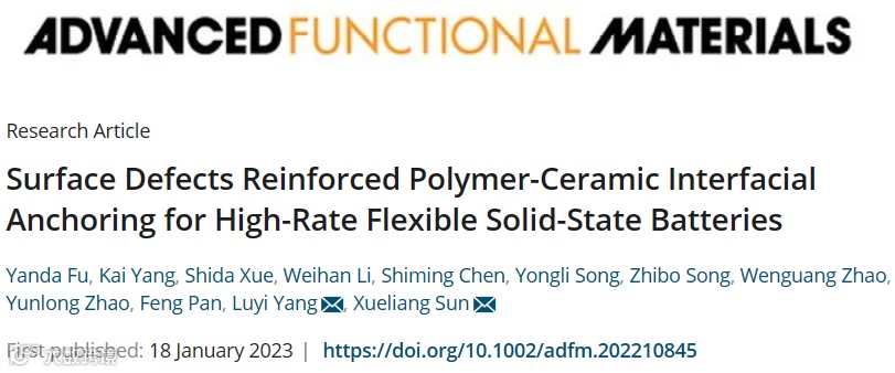 近期,北京大学深圳研究生院杨卢奕副研究员团队与西安大略大学孙学良院士团队在氧LLZTO陶瓷填料中引入表面缺陷(OV-LLZTO)并与PEO复合制备复合电解质,以表面缺陷为锚点构建了牢固结合的聚合物-陶瓷界面,这种键合效应有效地缓解了LLZTO填料的团聚和 PEO 的结晶,形成了具有高机械强度的均匀电解质膜,显著降低了与电极的界面阻抗,提升了锂离子传输能力,极大提升了固态电池的倍率性能及容量保持率。相关成果以标题为“Surface defects reinforced polymer-ceramic interfacial anchoring for high-rate flexible solid-state batteries”发表在《Advanced Functional Materials》。(DOI: 10.1002/adfm.202210845)北京大学新材料学院硕士生付彦达、萨里大学先进技术学院研究员杨凯、北京大学新材料学院博士生薛诗达为本文的共同一作。