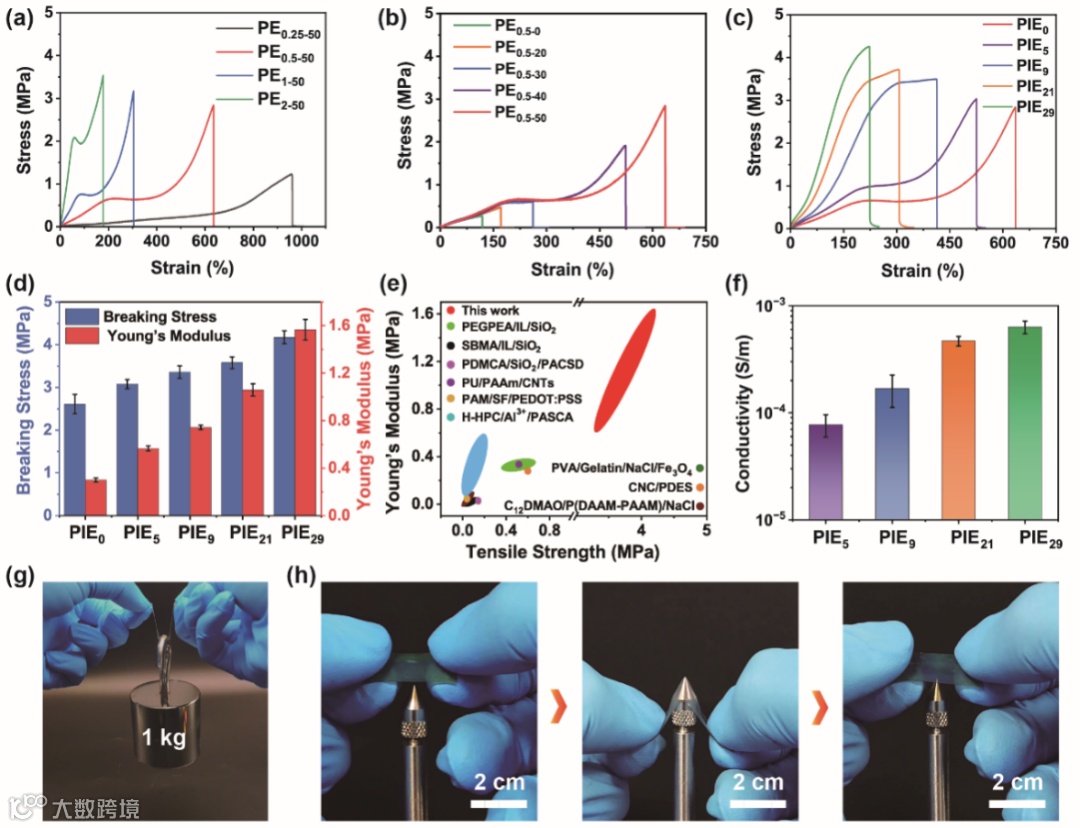 光子弹性体中,SiNPs含量增加,材料的断裂应力和应变都显著提高,打破了弹性体中机械强度和韧性的冲突。PIE中,LiTFSI含量增加,弹性体的模量和断裂强度提升,且离子导电率越高,克服了凝胶体系中机械强度与离子电导率的权衡。