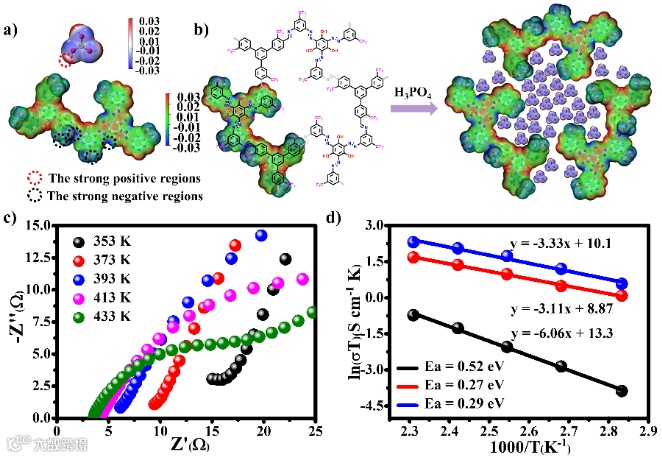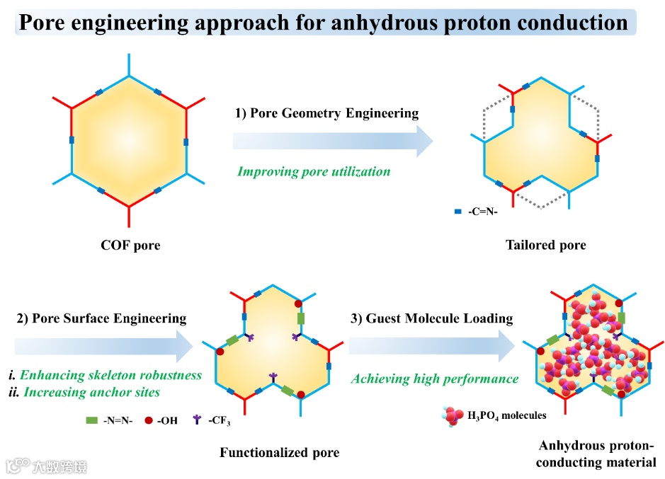 质子交换膜(PEM)燃料电池作为一种高效、便捷的氢能源利用技术,受到广泛关注。质子交换膜燃料电池的核心部件是质子传导材料。近几十年来,人们开发了各种质子传导材料,但由于水蒸气的露点较低,大多数材料的工作温度和压力都偏低,限制了它们在高温低湿条件下的应用。无水(干态)质子传导在极低的相对湿度下工作,其主要优点是电极动力学优异、热/水管理简便、对燃料和催化剂具有高耐受性。因此,研制工作温度宽、高性能的无水质子传导材料具有重要意义,但也面临很大的挑战。共价有机框架作为一类新型的多孔聚合物材料,在质子传导方面的应用越来越受到人们的关注。然而,目前大多数质子传导COFs需要在高湿度条件下工作,因为水中的氢键网络可促进质子的传输。对于无水质子传导,孔道环境发挥着重要作用,此时质子的运输只能通过Grotthuss机制,这就需要 COF载体提供充足、高效的跳跃位点。此外,无水质子传导材料需要高耐久性,与质子载体具有强相互作用,这对材料的设计和合成提出了更高的要求。