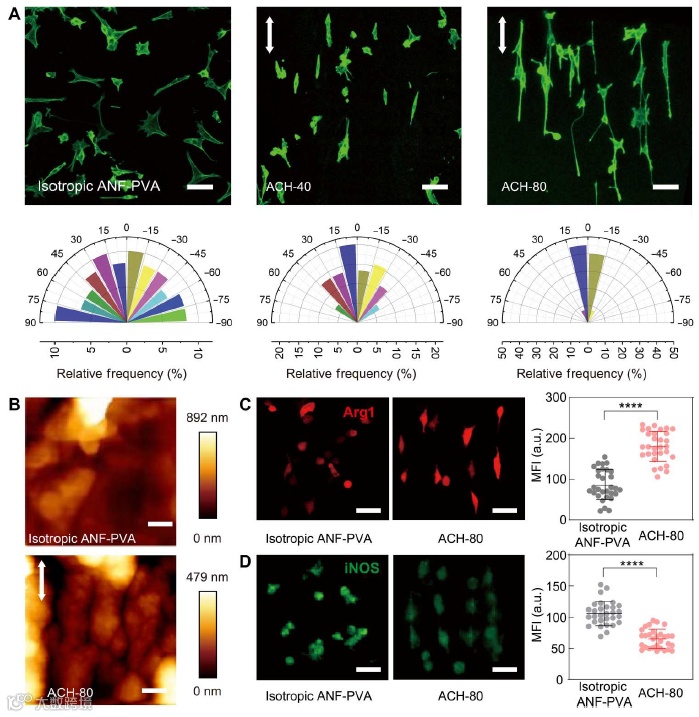 为了促进细胞对ACHs的粘附和机械感应,采用化学功能化方法,将RGD序列修饰在水凝胶上并与细胞膜上的整合素结合,从而促进ACHs上的细胞粘附。研究者发现ACHs可以诱导细胞发生明显的定向,定向程度随着纤维的排列程度增加而增加 (图3A)。原子力显微镜表明了ACHs表面有取向的微沟槽,这可以为细胞取向提供接触引导,也证明了自组装的表面形貌是影响ACHs上细胞取向的主要因素 (图3B)。除此之外,添加ROCK抑制剂Y-27623会大幅度减弱成纤维细胞的取向效果,这证实了细胞和水凝胶界面上的机械感应和机械传导过程对细胞各向异性形态发生的影响。除此之外,ACHs的各向异性特性促进了巨噬细胞的伸长,同时促进了M2生物标志物的表达并且抑制了M1生物标记物的表达。这对未来ACHs进一步应用于可植入式器件具有重要意义(图3C,D)。