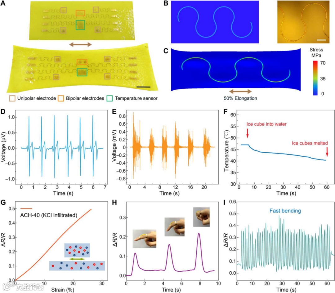 最后,他们通过在ACHs上集成柔性生物电子器件来实现多模态生理传感。具体来说,ACHs液体前驱体中PVA链上的羟基能与微加工器件的功能化表面相互作用,经溶剂交换固化后,ANF-PVA水凝胶与转印的电子器件之间形成了稳定的结合 (图4A)。硅片上的电子器件采用蛇形设计赋予其承受高拉伸的能力,以承受形成ACHs所需的预拉伸和干燥处理。有限元分析(FEA)表明,蛇形的器件在50%拉伸过程中的应力分布明显低于其组成材料[如聚酰亚胺(PI)和金]的失效阈值 (图4B, C)。为了展示其传感功能,ACHs上的生物电极阵列用于测试来自皮肤的电生理信号,从而获得高质量的心电图(ECG)和肌电图(EMG)记录 (图4D, E)。基于封装的薄膜电阻的温度传感器即使在水介质中也展现出出色的温度响应 (图4F)。此外,他们设计了一种基于ACHs的离子电导率的应变传感器,可以监测不同振幅和频率的关节运动(图4 G-I)。