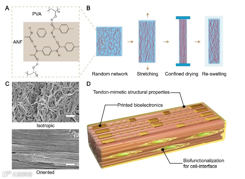 调和天然生物组织和工程材料之间的不匹配是目前先进生物医学设备和组织工程平台发展的关键需求。然而,天然组织表现出许多合成材料难以复制的特征。例如,肌腱具有与柔软生物聚合物交织的平行的胶原纤维分层组织,它们含有约60 wt. %的水,同时拥有GPa级别的超高模量和55-120 MPa的机械强度。肌腱的各向异性结构不仅为肌肉骨骼系统提供了基本的承重能力,而且还通过界面相互作用为细胞的行为提供重要的生物物理环境。近年来大量的研究工作致力于设计具有高结构各向异性的仿肌腱材料。然而这些方法制备出的材料不是模量仍然比天然肌腱低几个数量级,就是难以模仿承重软组织中的微观结构相互作用从而无法重现天然肌腱的许多力学行为(如应变硬化和粘弹性响应等)。此外,仿肌腱材料的功能化很少被关注,因此限制了其在生物医学应用方面的潜力。