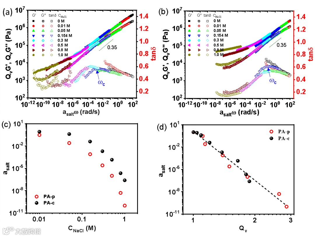 图 4. 通过时间-盐叠加原则构建的动态机械行为的master curve曲线以及相应的平移因子asalt。