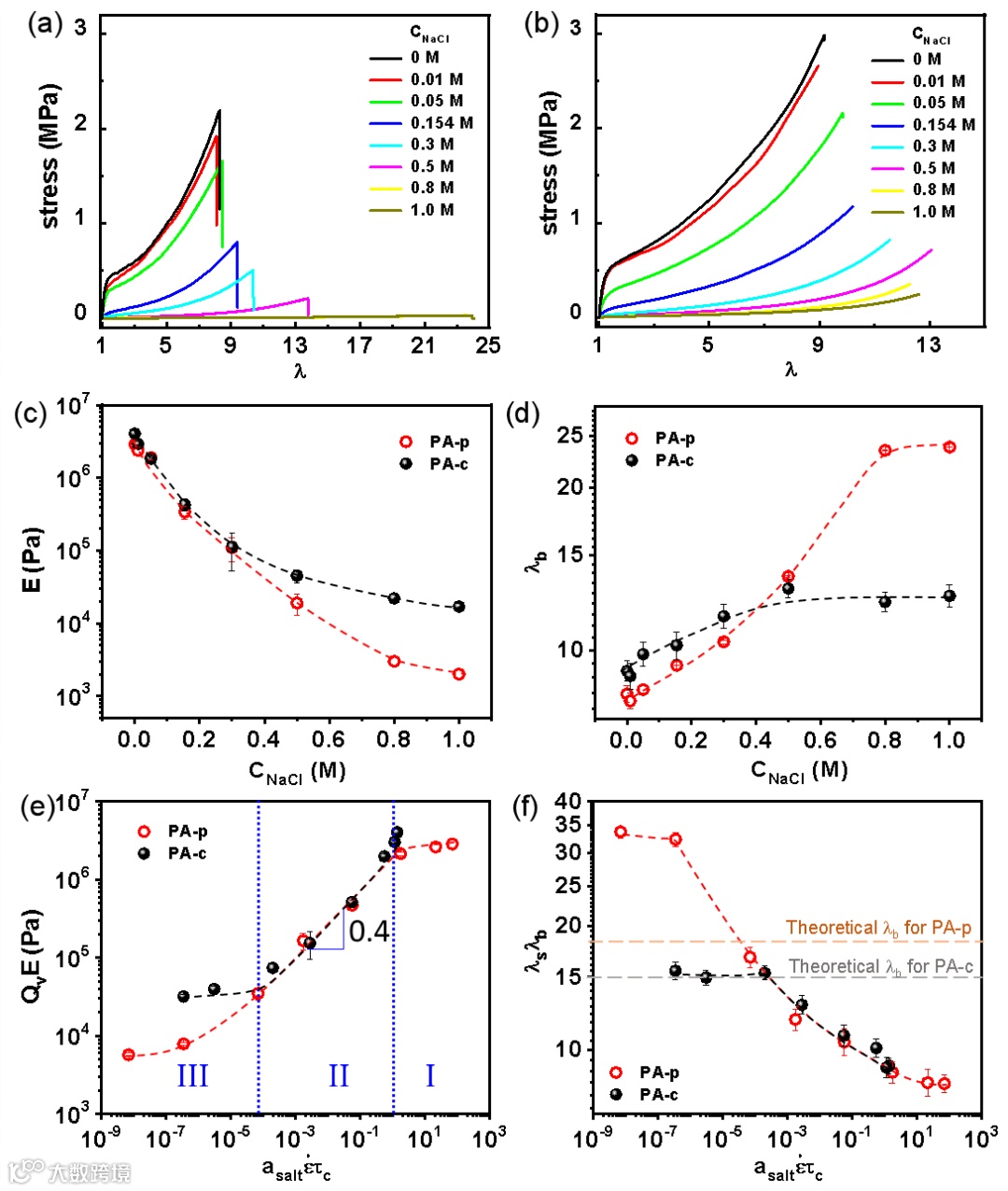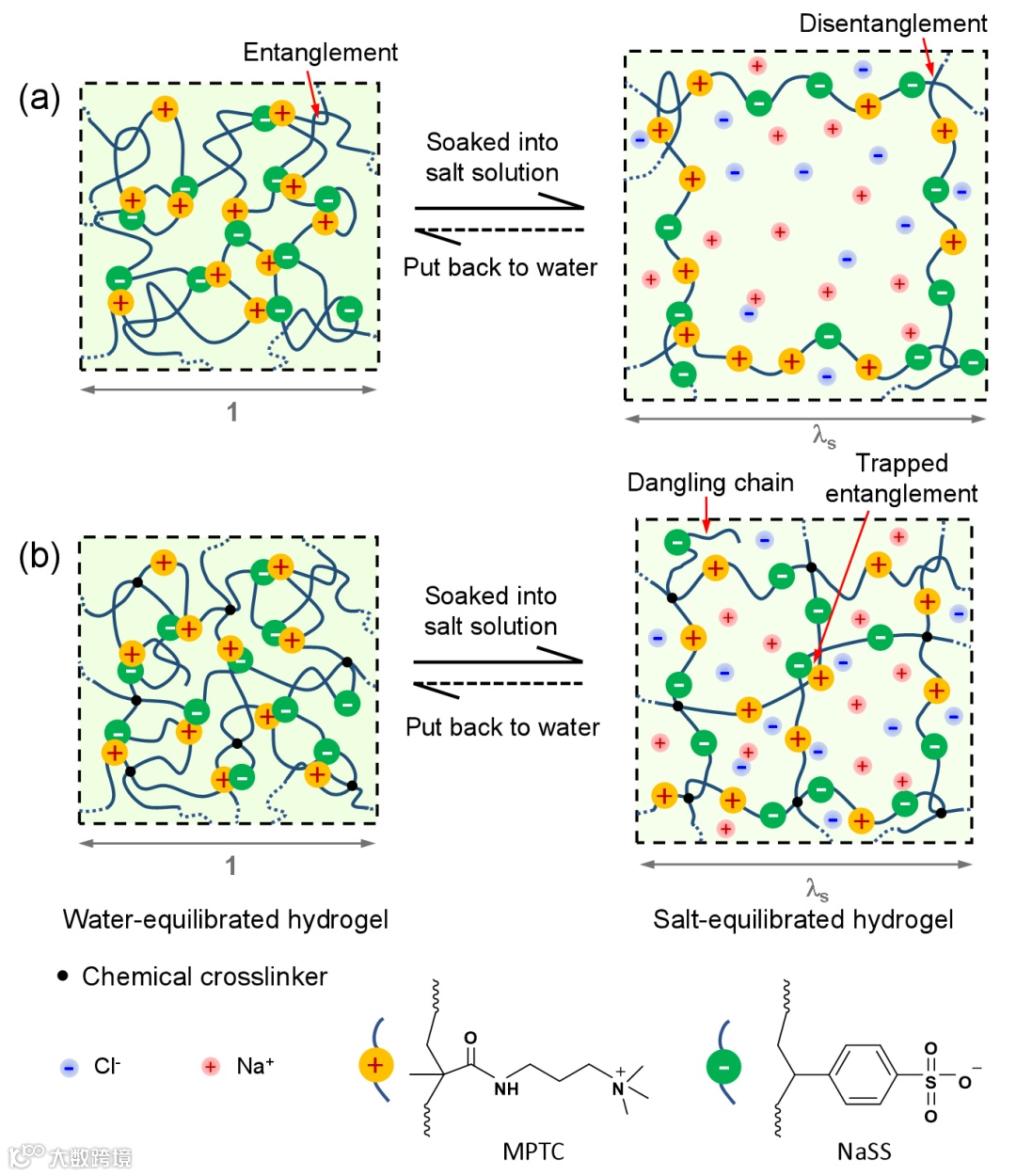 图1. 盐溶液对(a)主网络只由拓扑缠结网络构成的PA胶(PA-p)和 (b)主网络由化学交联和拓扑缠结网络构成的PA胶(PA-c)的影响的图示。浸入 NaCl 溶液后,PA胶溶胀。以水平衡凝胶(salt-free)为参考状态(长度溶胀比=1),盐平衡水凝胶的长度溶胀比为λs。