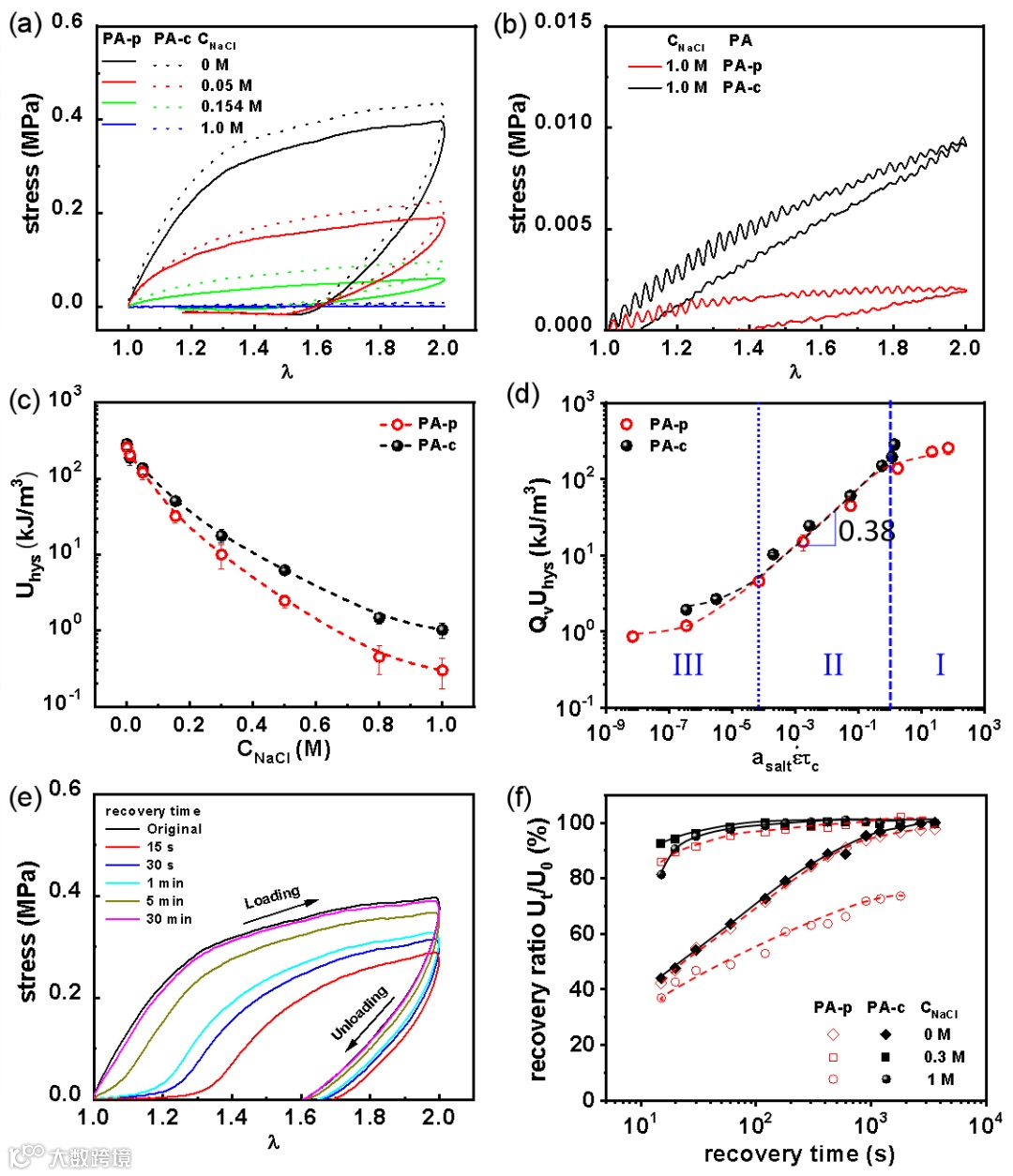 众所周知,高浓度盐溶液使离子动态键构筑的高韧性水凝胶溶胀且变脆变弱。厘清此类水凝胶在盐溶液中的动态机械行为对于其应用至关重要,尤其是在生物医学领域。为此,北海道大学龚剑萍教授团队联合四川大学罗锋副研究员以PA胶为模型体系,阐述了盐浓度对流变响应和机械行为的影响。通过对一种主网络只由拓扑缠结网络构成的PA胶(PA-p)和一种主网络由化学交联和拓扑缠结网络构成的PA胶(PA-c)的系统研究,该团队证明了盐对机械性能(包括小应变模量、大变形能量耗散和断裂拉伸比)的影响,可以有效地转化为频率或应变率依赖性,遵循时间-盐叠加原理 (time-salt superposition principle)。因此,他们在室温下能够实现从10-11到102 rad/s 的宽泛观测时间尺度,涵盖三个区域:(I) 来自动态和初级网络的高频平台区,(II)来自离子缔合的 Sticky Rouse 运动的粘弹性区,以及 (III) 来自主网络的低频平台区。此外,他们也加深了在长时间尺度区间III的拓扑缠结解缠结行为的理解。这项工作不仅为水凝胶在盐水环境中的生物学应用提供了指导,而且为其他具有双重交联动态结构系统的增韧机制提供了重要的见解。该工作以题为《Effect of salt on dynamic mechanical behaviors of polyampholyte hydrogels》发表在《Macromolecules》上。