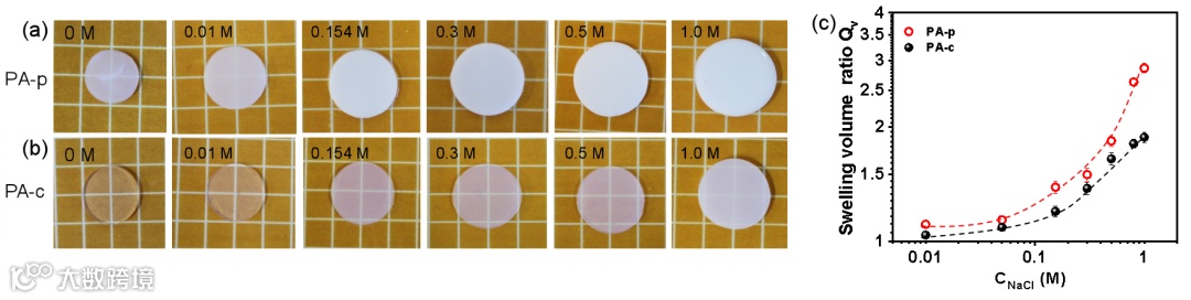 图2. 盐浓度 (CNaCl) 对平衡 PA 凝胶的外观和溶胀行为的影响。