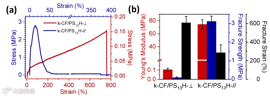 图2 (a)复合水凝胶在平行和垂直于纤维方向的的应力-应变曲线。(b)相应的杨氏模量,断裂强度和断裂应变。
