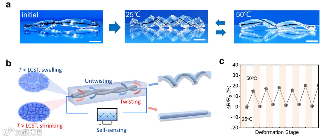图5 (a)复合水凝胶形变的照片;(b)热响应驱动中4D螺旋驱动器的自传感原理图; (c)水凝胶螺旋在25°C和50°C可逆驱动,驱动过程由电阻率可逆变化监测。