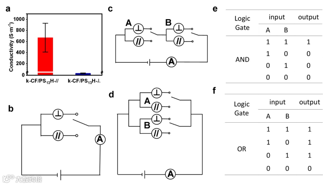 图3 (a)水凝胶的各向异性电导率;(b)基于各向异性水凝胶的逻辑门单元;(c)“与门(AND Gate)”,(d)“或门(OR Gate)”和(e,f)相应的赋值表。
